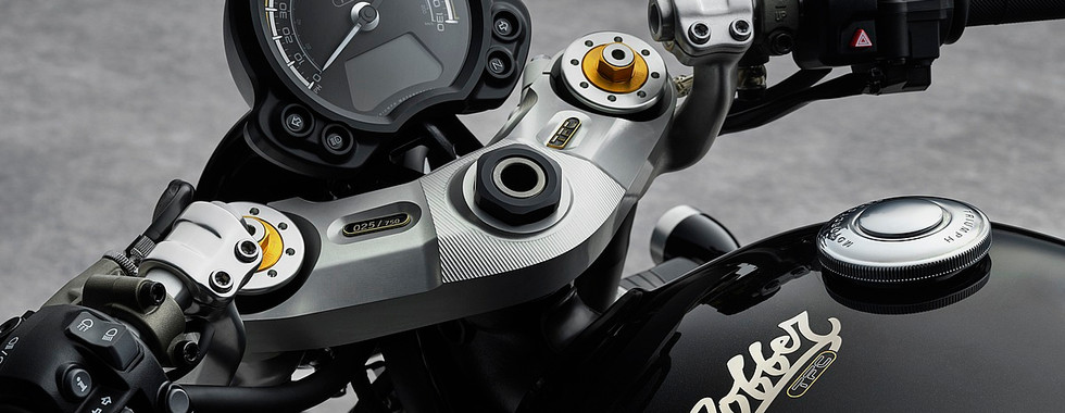 A roda dianteira estreita de 1,9 polegadas contrasta com o pneu traseiro largo. O visual é reforçado pelos dois silenciadores Akrapovic em preto fosco que emitem um som inebriante. A Triumph Bonneville Bobber TFC possui suspensão Öhlins em ambos os eixos e pinças de travão radiais monobloco Brembo M50 com discos de 310 mm.