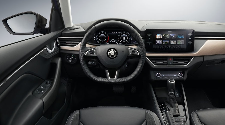 No interior bem desenhado, irradia um design elegante, espaço excecional e tecnologia digital de ponta. O cockpit virtual exibe especificações do computador de bordo em combinação com outras informações, como, por exemplo, a navegação. Pode escolher-se entre cinco layouts, controlados através do botão “View” (Visualização) no volante. O cockpit virtual do SCALA dispõe de um ecrã de 10,25 polegadas – o maior no segmento dos hatchback compactos. Por sua vez, a iluminação ambiente branca ou vermelha ao longo do painel de instrumentos torna o espaço mais acolhedor e confortável.